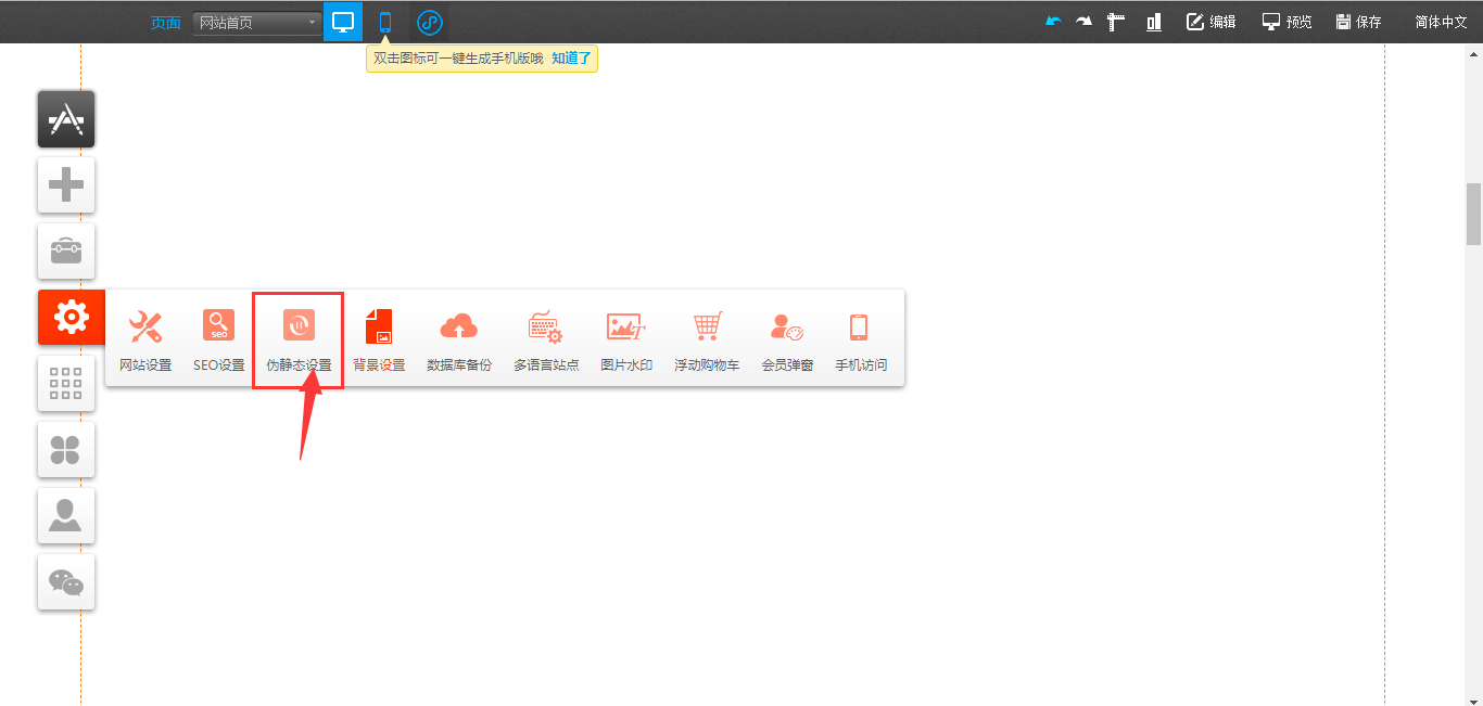 1.以PC版为例,首先在建站编辑器中点击“设置”-“伪静态”-“添加伪静态规则”,选择页面的类型“产品列表”或“文章列表”,进行伪静态的设置,设置完成后点击“保存”,然后在编辑器中拖入“文章分类”或“产品分类”,点击“设置”,将分类链接页面与在伪静态设置中的页面选择一致即可,然后点击保存,如图所示: